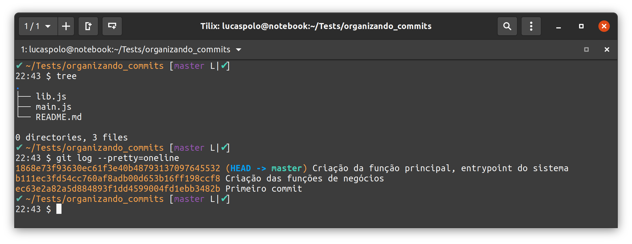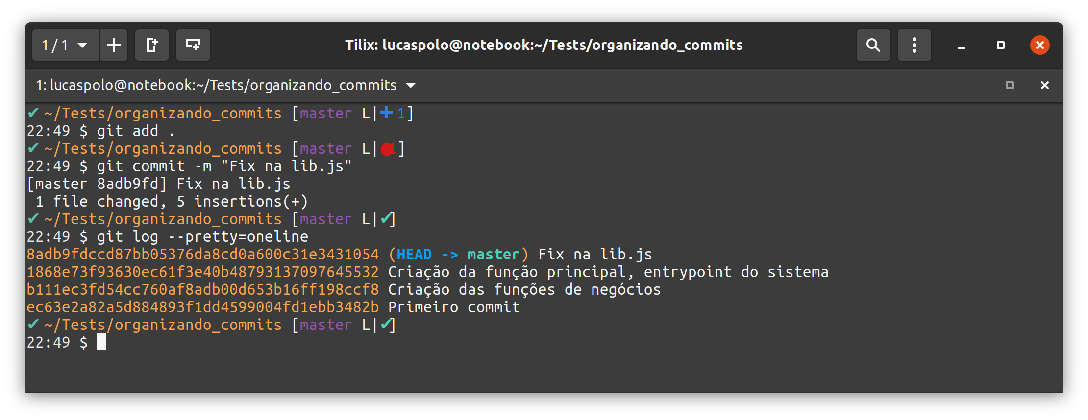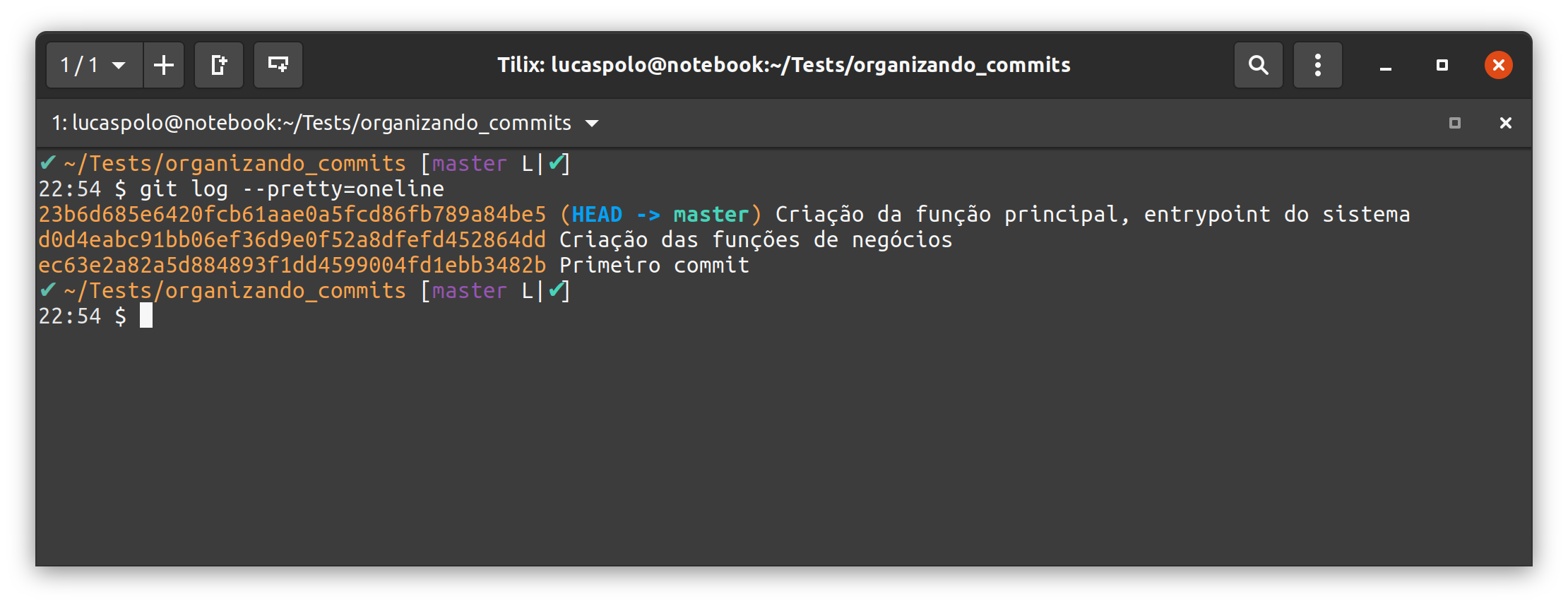 Após isso os commits estarão mais organizados, isso ajudará você a navegar melhor pelo seu histórico de commits, ajudará também os revisores que poderão fazer o review por commits e não ficar pescando trechos de códigos em diversos commits diferentes.