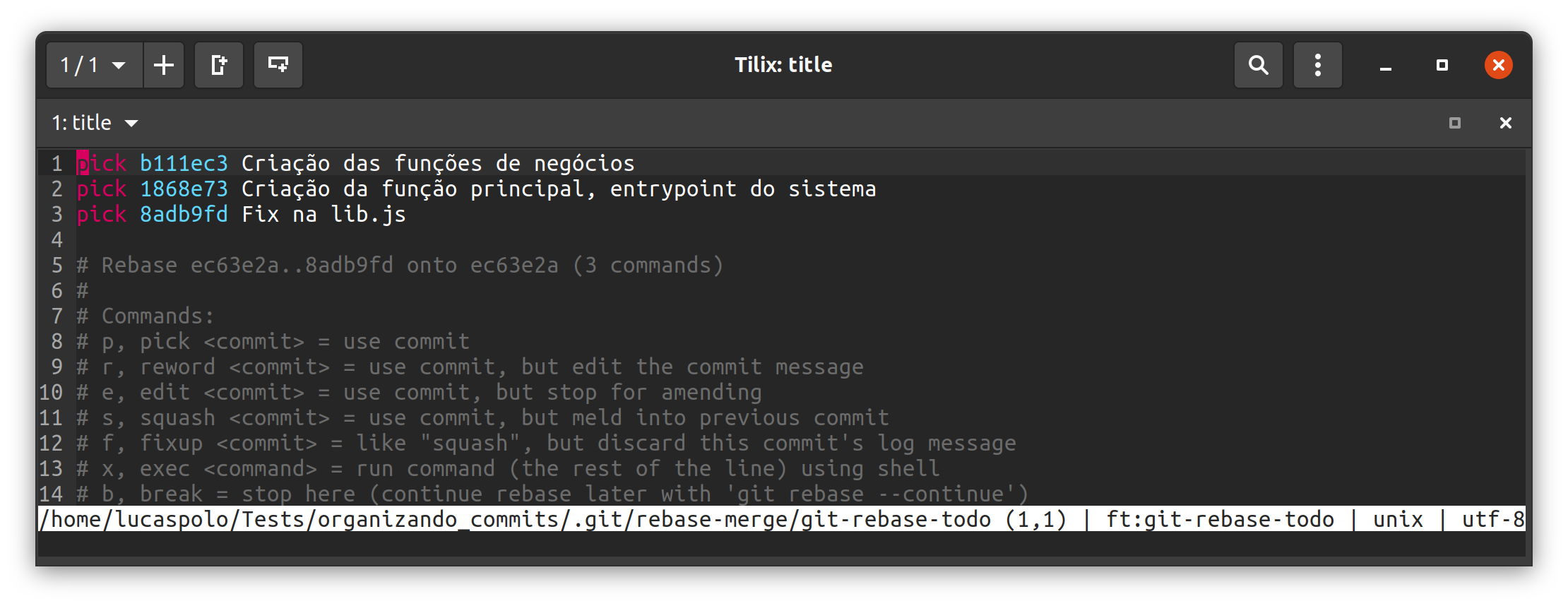 A janela que abre contém a lista de commits e algumas instruções do que podemos fazer. No nosso caso queremos juntar o commit Fix na lib.js com o commit Criada lib de funções, para isso vamos fazer duas coisas, reordernar os commits e pedir para fazer um fixupno commit de fix, ficando: