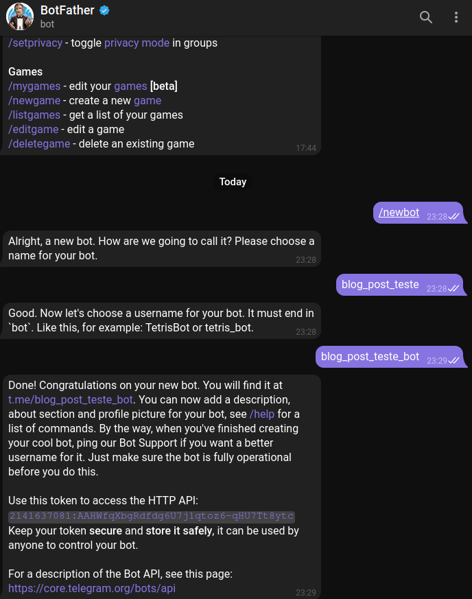 Após seguirmos as instruções e configurarmos o nosso bot receberemos um token que será utilizado por nós mais a frente.