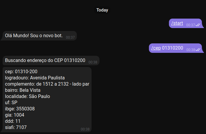 Para usar a nova funcionalidade do bot basta enviar o comando /cep CEP e ele irá retornar o CEP buscado na API do ViaCEP.