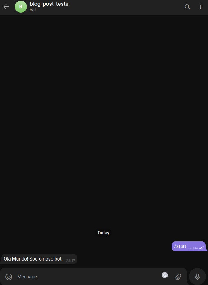 O script é simples, lemos o token de uma variável de ambiente (você também poderia colocar direto no código, mas não recomendo fazer isso) e criamos os objetos do Telegram para subir o nosso bot. Na linha 15 fazemos o registro da função que irá responder um comando ao bot, nossa função é bem simples e apenas faz o envio de uma mensagem de texto. Após a configuração do bot iniciamos o polling, ou seja, o script fica ouvindo se há mensagens novas para responder. Assim entramos em nosso bot, enviamos o start e já recebemos a mensagem: