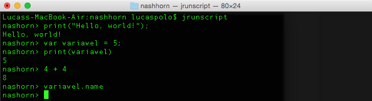 A primeira coisa que notamos, é que além de rodar scripts, foi criado um interpretador interativo, onde você digita os comandos e recebe o resultado na hora, similar aos já existentes em Python e Ruby. Para acessa-lo basta digitar o comando jrunscript: