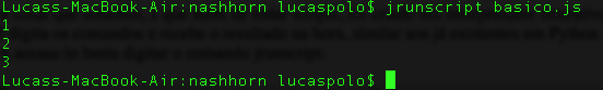 Note que alguns comandos já executam normalmente, como o print, criação de variáveis e também operações aritméticas. Porém, não temos apenas o interpretador interativo, podemos executar diretamente scripts, bastando colocar no prompt jrunscript seuarquivo.js, vejamos um exemplo:
